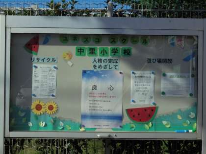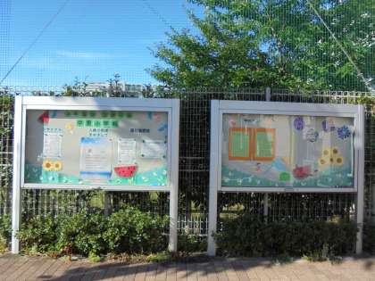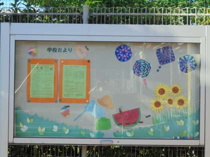 8月の外の掲示板です。すまいるルームの先生たちが、今月も飾りつけをしていました。花火やスイカなど、季節感あふれるデザインです。