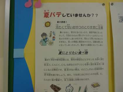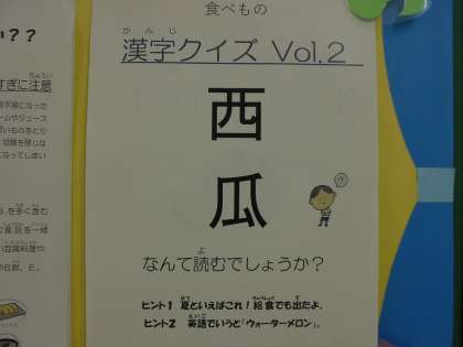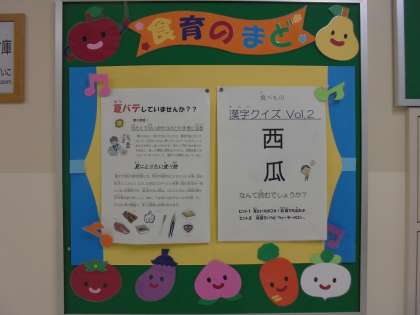 子どもたちに、夏休み中でも元気に過ごしてほしいとの願いを込めて、栄養士さんが「食育のまど」第3弾を掲示しました。今回のテーマは、「夏バテにならないために」です。食べ物漢字クイズは「西瓜」です。