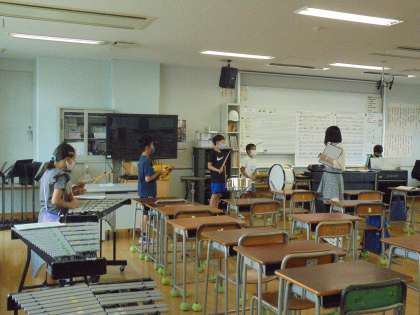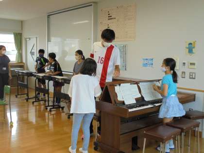 わくわくサマースクール後半から始まった「特別講座」2日目は、音楽でした。4年生以上が「トレイントレイン」の合奏練習に取り組みました。パート練習ののち、最後は合奏にも挑戦しました。