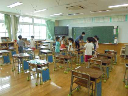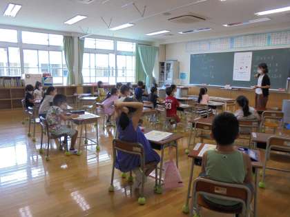27日(木)、わくわくサマースクール後半の4日目です。4年生以上の特別講座は図工でした。色違いのカードを並べてデザインを考えました。1年1組はたし算じゃんけんを、1年2組は0(ゼロ)のたし算をそれぞれしました。