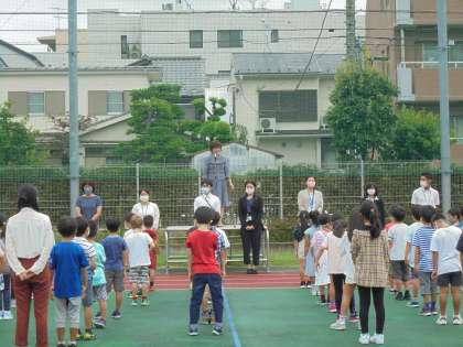 9月1日(火)、第2学期始まりの日です。午前8時30分から、校庭で始業式を行いました。校長先生のお話の中で、特別支援教室(すまいるルーム)の先生の紹介をしました。さらに、給食を作ってくださる栄養士さんと調理員さんの紹介もしました。