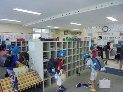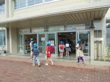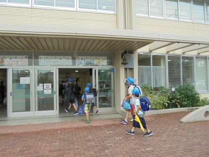 9月2日(水)、2学期2日目の登校の様子です。ランドセルを背負い、手提げ袋を持って登校する子どもたちが多いです。昇降口に入ると、「重かった。」という声も聞こえてきました。