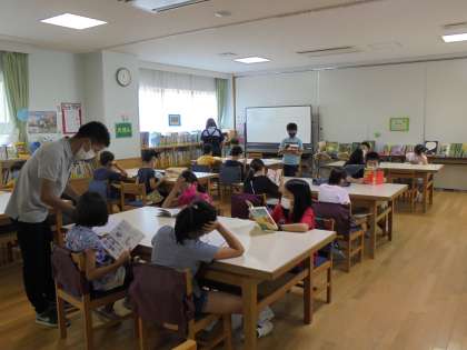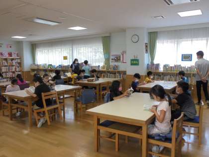 2日(水)の4時間目、4年1組は図書室にいました。夏休み中に借りた本の返却をしてから、課題図書や新刊本を読んでいました。図書室内は、秋の装いになりつつあります。