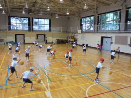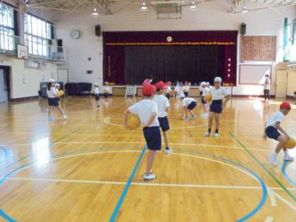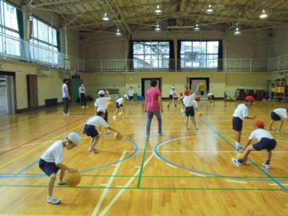 3日(木)の2時間目、2年1組は体育の時間でした。体育館で「ボールあそび」をしました。1学期の終わりに少し学習をしていたので、復習も兼ねていました。ドリブルや上投げキャッチが難しそうでした。