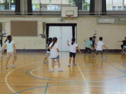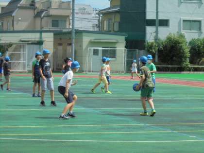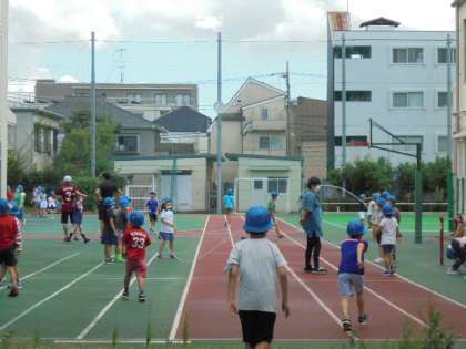おなかが満足した子どもたちは、次々に校庭に出てきて遊び始めました。日差しが強いことから、校帽をかぶって外に出ました。2年生は体育館遊びの割り当てだったので、元気に鬼ごっこをしていました。