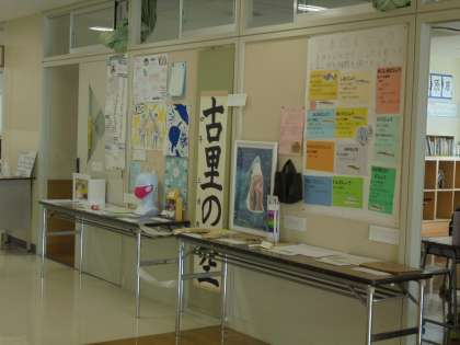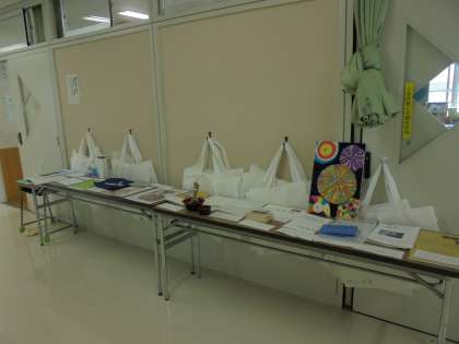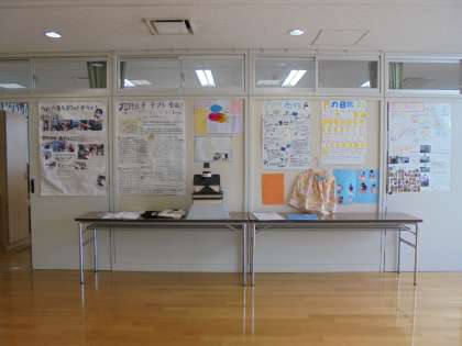 教室前の廊下には、夏休み中に取り組んだ「自由作品」が展示されています。写真は上から、4年2組、4年1組、5年1組です。