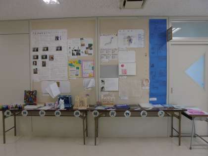 自由作品から、子どもたちの努力のあとが伝わります。休み時間に作品を見合う子どもたちの姿がたくさんあり、そこも学びの場となっています。写真は上から、6年1組、3年1組、2年1組です。