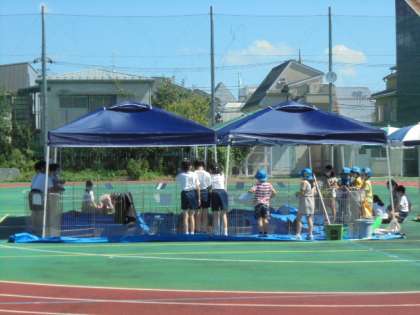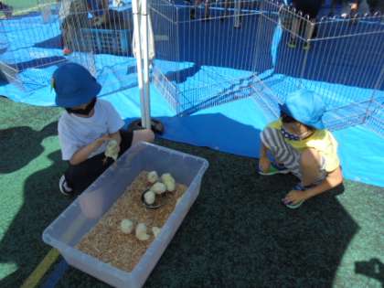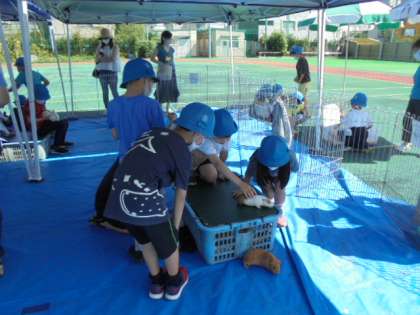 移動動物園を開園しているため、中休みと昼休みの校庭遊びは、ありませんでした。3年生以上の子どもたちも、動物たちを見ることができました。「かわいい」と言いながら、モルモットやウサギ、ヒヨコを眺めていました。午後からは2年生が動物たちと触れ合いました。