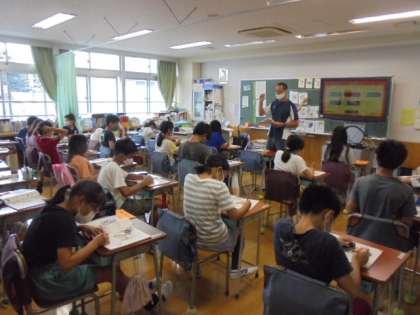11日(金)の3時間目、5年1組は外国語の時間でした。担任の先生と英語支援員とで進めています。今回は、時間割について表現の仕方を練習したり、教科名を書いたりしました。