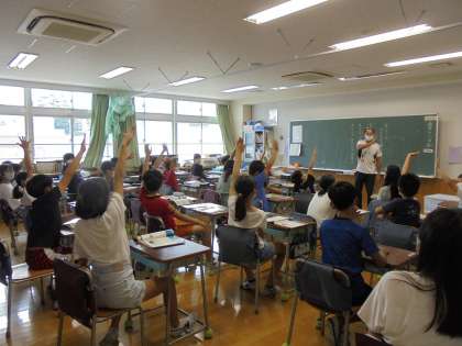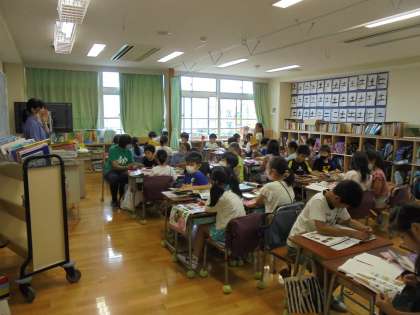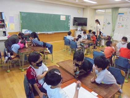 写真は上から、2年1組、3年1組、5年1組です。2年1組は「学級のめあてを考えよう」と班ごとにホワイトボードに話し合ったことを書いていました。3年1組は理科の時間で、昆虫についての調べ学習に取り組んでいました。5年1組は、あいさつ標語についての話し合いをしました。