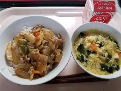 たまねぎを使ったスタミナ丼の献立です。豆板醤やコ