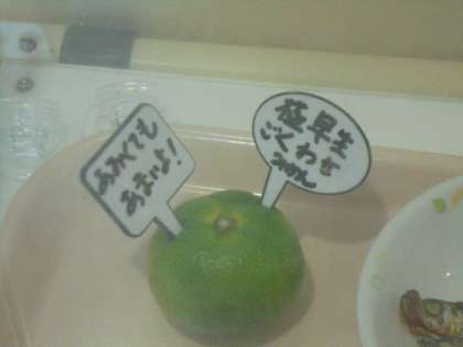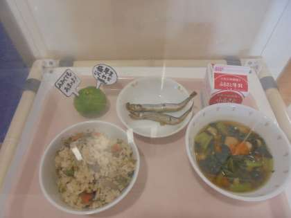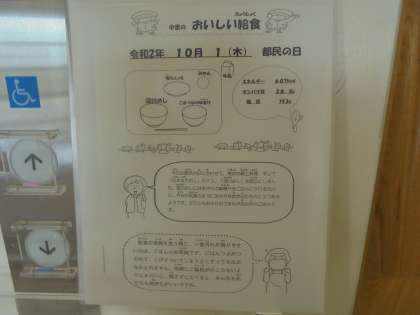 各階のエレベーター前には、給食の配膳見本が置いてあります。給食前になると、子どもたちはこの見本をよく見に来ます。今日の献立に、極早生みかんが登場しました。みかんの紹介をする立て札がついていて、子どもたちもよく見ていました。配膳見本の他に、献立紹介のおたよりも掲示しています。給食室の皆さんの思いが伝わります。