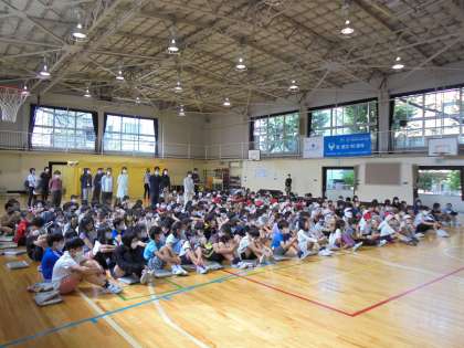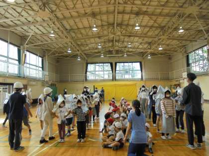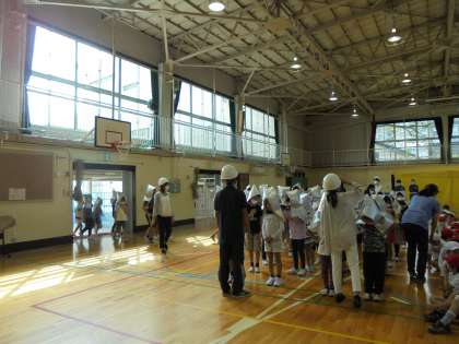 6日(火)の2時間目、避難訓練を行いました。今回は、「主事室からの出火」として、夕焼け階段のみを使って体育館まで避難しました。防災頭巾を被り、「おかしもち」の約束を守って避難しました。