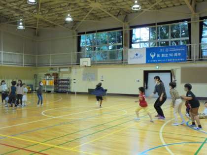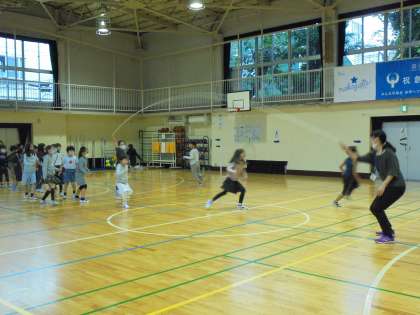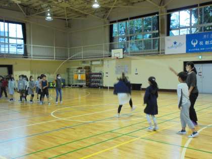 9日(金)の昼休み、体育館使用割り当ては3年生でした。長なわ跳びをみんなでやっていました。先生の「ハイ、ハイ」というかけ声に合わせて、上手に跳んでいました。