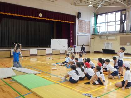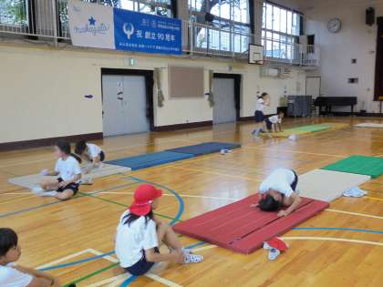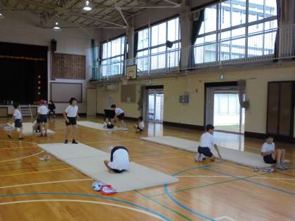13日(火)の5時間目、4年2組は体育の時間でした。体育館でマット運動の前転と後転に取り組みました。今回は、4年1組の担任が指導をしました。子どもたちは、後転ができるようになるためのポイントをよく聞いていました。