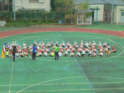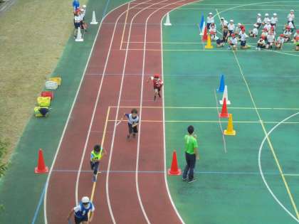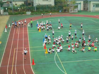 14日(水)の5時間目、3年生と4年生が合同で体育を行いました。「中里スポーツフェスタ」で披露する団体競技の初練習でした。全員リレーをするため、4チームに分かれて、バトンをつなぎました。元気な応援が校庭中に響いていました。