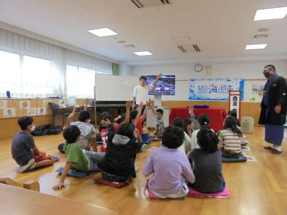 15日(木)の4時間目は4年2組が出前授業に参加しました。落語の次は、海の問題を環境専門家から話していただきました。海の温暖化、海洋プラスチックごみ問題、お寿司がなくなるかも・・といった内容でした。子どもたちからは質問がたくさん出ました。