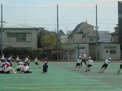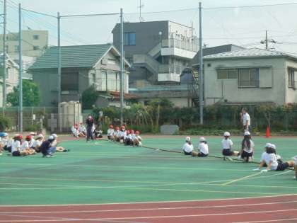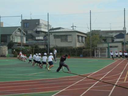 22日(木)の3時間目、5年生と6年生は団体競技の練習を行いました。団体競技とは「つな引き」です。密を避けるために、つなに目印を付け、仲間が校庭を半周走って、助けに行きます。