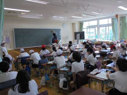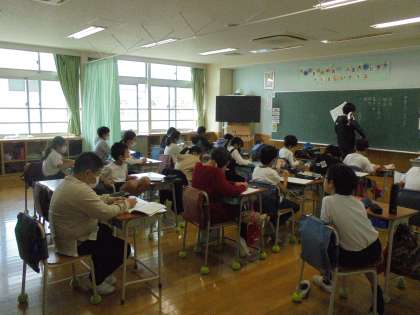 26日(月)、午前8時25分から放送朝会をしました。子どもたちは、校長先生の話を聞きながら、中里スポーツフェスタの目標を考えました。写真は、校長先生の話の様子、4年2組、3年1組の様子です。