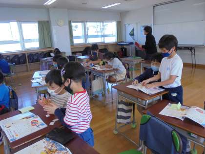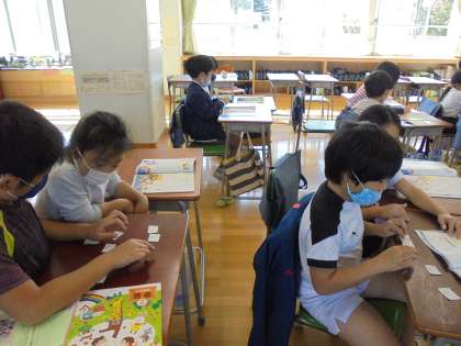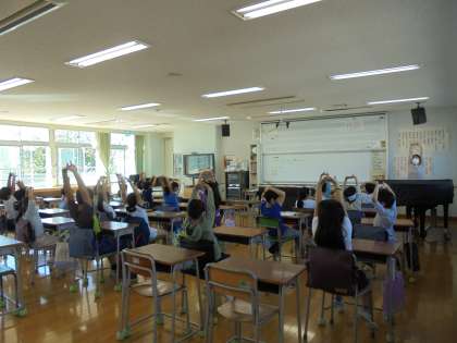 26日(月)の3時間目、2年1組は音楽の時間でした。歌う前に身体をほぐしてから、元気よく「ゴーゴーゴー」を歌いました。この曲は、赤組と白組とに分かれて歌うので、毎回とても盛り上がります。歌のあとは、今回のメイン、「リズム作り」をしました。6種類のリズムの中から、3つを選び、その内の1つを繰り返して4小節のリズムを作りました。2人組で作りましたが、同じリズムになったグループはありませんでした。子どもたちの創作意欲の高さを感じました。