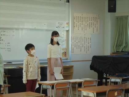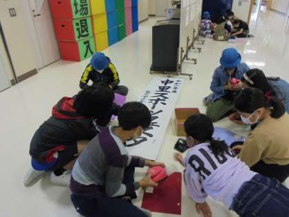 26日(月)の6時間目、5年生と6年生はスポーツフェスタの係りの仕事をしました。応援団を含めて5つの係りがあります。写真は、表示係り、採点係りの様子です。表示係りは、校長先生が書いた立て看板に飾りをつけました。採点係りは、エンディングで披露する得点発表の練習をしていました。