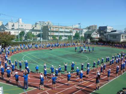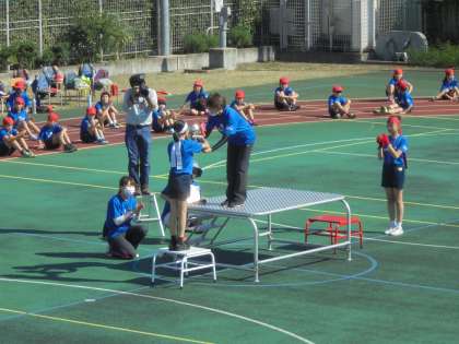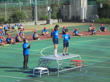 高学年リレーの興奮の余韻を残しつつ、整理運動へと進みました。運動委員が朝礼台から手本を示し、全員で身体をほぐしていきました。そして、エンディングです。最初に結果発表を行いました。今年度は得点の表示をせずに実施したので、子どもたちは静かに聞いていました。白組の優勝がわかると、歓声と拍手が沸き起こりました。