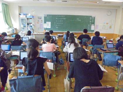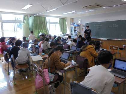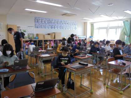 11月2日(月)の4時間目、5年1組は総合的な学習の時間でした。タブレットを使って、お米の炊き方やおにぎりの具材などについて調べました。中には、直接友達に「おにぎりの具材で何が好き?」と尋ね歩く人もいました。5年生がバケツで育ててきたお米の収穫も近いようです。