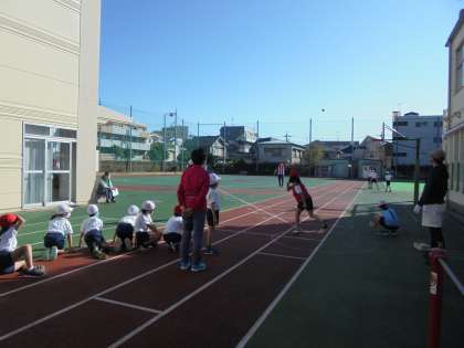 5日(木)は、2学年ずつ体力テストを実施しました。校庭では、ソフトボール投げを行いました。上級生の投げたボールが遠くまで飛ぶのを見た下級生は、「すごい!」と驚いていました。
