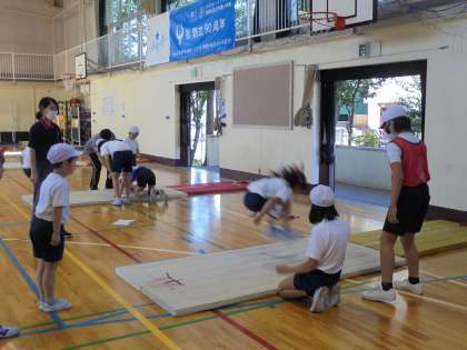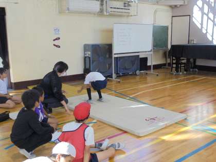 5日(木)、体育館では、5種類の体力テストを行いました。立ち幅とびは、マットを使って行いました。両腕を振って弾みをつけ、「それ!」と跳んでいました。
