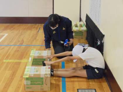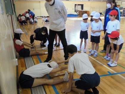 長座体前屈は、膝が曲がらないように気を付けなければなりません。子どもたちは「あと少し」と痛みをこらえて押していました。