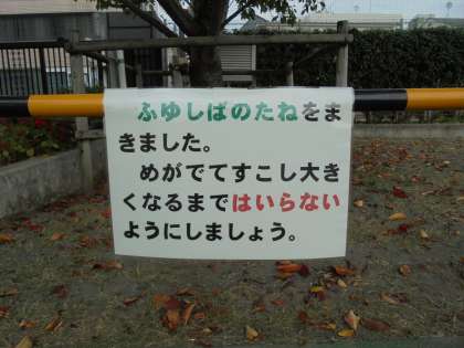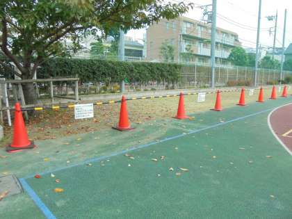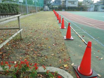 「スポーツフェスタ」が終わり、校庭の芝生に冬芝の種を播きました。これから約1ヶ月、養生のため、できるだけ入らないようにとコーンを並べました。芝生の管理は、世田谷区から委託された業者とともに行っています。