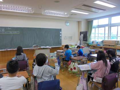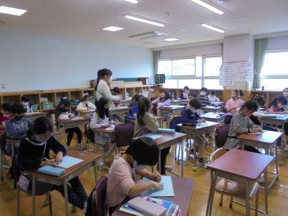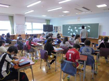 9日(月)の4時間目、3年1組は算数の時間でした。2クラスに分かれて学習しています。この日から「三角形」の単元に入りました。いろいろな三角形を書いたり、作ったりして仲間分けをしました。