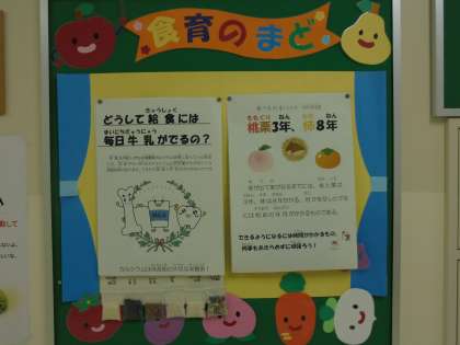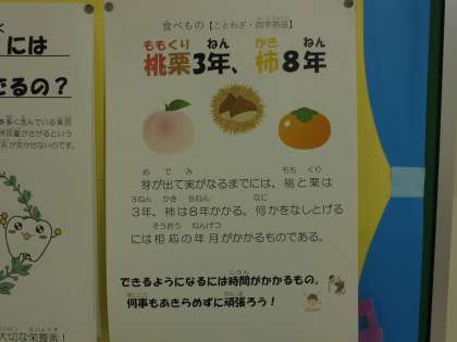 9日(月)、1階廊下にある「食育のまど」が更新されました。今回は、食べ物のことわざを紹介しています。その言葉は、「桃栗3年、柿8年」です。何事もあきらめず、最後まで頑張ってほしいという栄養士のメッセージが込められています。