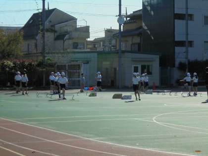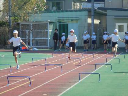 11日(水)の2時間目、4年2組は体育の時間でした。小型ハードル走に取り組んでいました。歩幅に合わせてコースを用意し、リズムよく飛び越す練習をしました。
