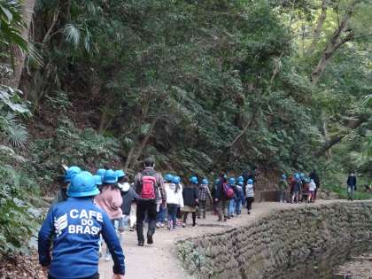 次に行ったのは、等々力渓谷でした。夏は涼しい場所ですが、少し肌寒い今日の気温は9,7度。それでも、皆、自然を身体いっぱいに感じながら、楽しく歩きました。カモがいたり、滝があったり、渓谷の音を聞きながら、気持ちのよいミニハイキングができました。