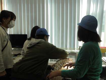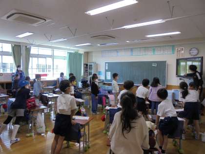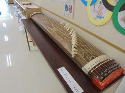 13日(金)の朝、放送による音楽集会を行いました。集会委員が2種類の楽器の音を出して、2択のクイズにしました。第1問は、タンブリンでした。正解を喜ぶ声が、1階の放送室にいても聞こえてきました。第2問は、琴でした。放送室内で3人で楽器を支え、音を出しました。2種類の楽器は、職員室前に展示して触ってよいことになっています。クイズの後は、今月の歌を歌いました。英語の歌詞のため、学級によっては、歌詞を大型テレビに映していました。