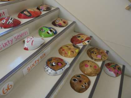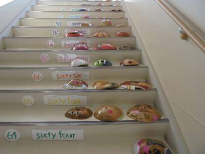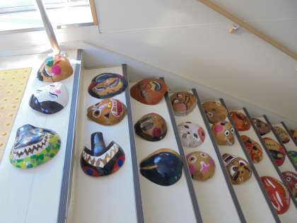 12日(木)に6年生が描いた「ふくべ細工」は、現在乾燥中です。その場所は、青空階段の屋上につながる階段です。講師にニスを塗ってもらい、子どもたちがここまで運んできました。一つ一つの表情がとてもすてきです。