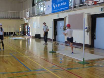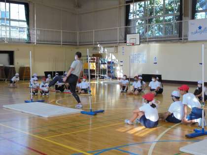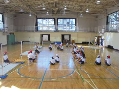14日(土)の1時間目、5年1組は体育の時間でした。体育館で「走り高跳び」に取り組んでいました。1回目とあって、跳び方(はさみ跳び)の話を聞いてから練習を始めました。