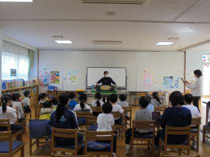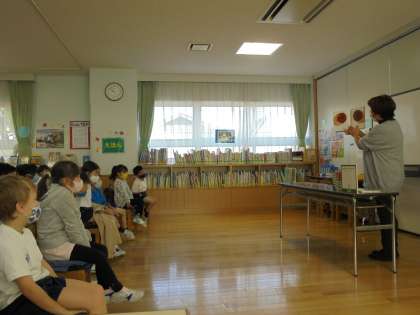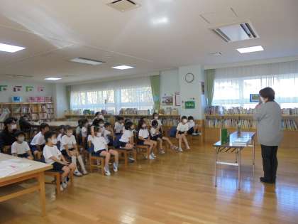 16日(月)の2・3時間目、1年生は図書室で開かれた「おはなし会」に参加しました。今回は、「ぶっく・らぼ」の皆さんにお越しいただきました。2時間目は1組が、3時間目は2組が、それぞれに楽しいお話を聞きました。「きょだいな きょだいな」のお話は、大型本が登場し、それだけでも大喜びでした。