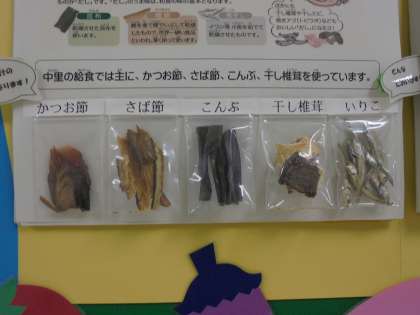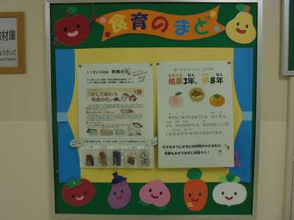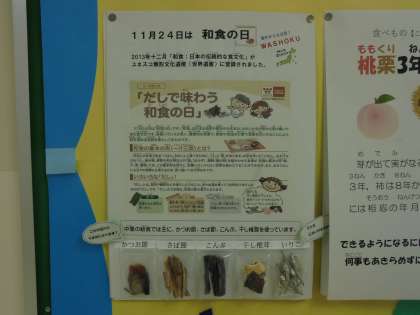 11月も後半に入り、「食育のまど」の一部が新しくなりました。今回のテーマは、「和食」です。11月24日は「和食の日」。和食に欠かせないのが「だし」です。「かつおぶし」や「こんぶ」など5種類の素材を小袋に入れて紹介しています。