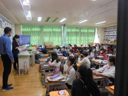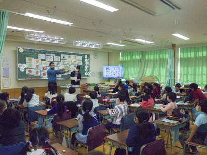 18日(水)の1時間目、3年1組は外国語活動の時間でした。担任の先生とALTとで進めています。最初に、これまで学習で出てきた単語の復習をしました。食べ物やスポーツなど黒板いっぱいに言葉が登場し、子どもたちはその発音をよく覚えていました。