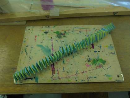 19日(木)の3・4時間目、1年2組は図画工作の時間でした。最初に、細長い画用紙2枚を組み合わせて飾りを作りました。画用紙を長くつなぎ合わせてから、根気よく三角に折り返す作業をしていました。