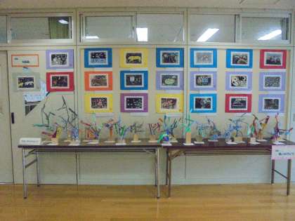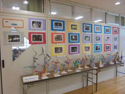 4年生の廊下には、図画工作の時間に取り組んだ立体作品が展示してあります。今回、「木版画」も一緒に飾られました。初めて彫刻刀を使った作品ですが、とても素晴らしいです。