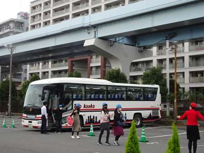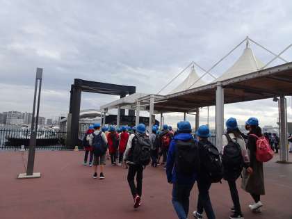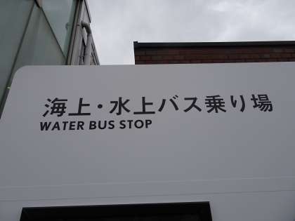 日の出桟橋に到着。水上バスは、定期便で、貸し切り状態でした。違う学校は、その学校の貸し切り水上バスで移動していました。波が高いかと思いましたが、乗り心地は最高でした。レインボーブリッジを背に、浅草吾妻橋に出発しました。