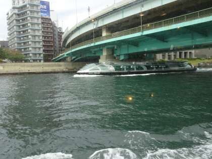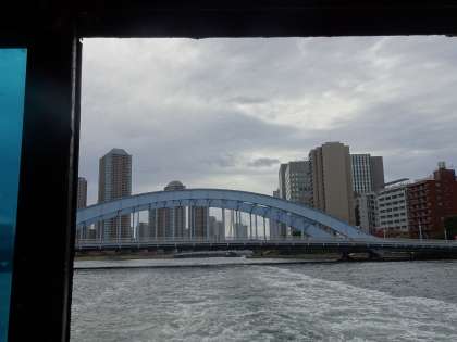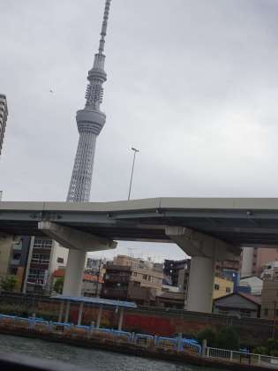 水上バスからの眺め。スカイツリーも見えてきました。隅田川の花火で映る橋もくぐりました。今日はラッキーな1日です。雨も降らず、風の心配もなく、気持ちよいクルーズとなりました。