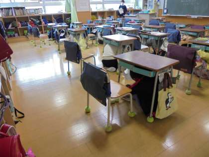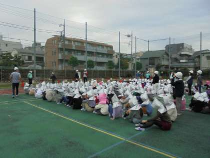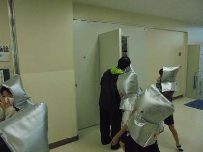24日(火)の2時間目、避難訓練を行いました。想定は、地震発生後、給食室から出火としました。子どもたちは、緊急放送を聞いてすぐ机の下に潜り込みました。その後、防災頭巾をかぶり校庭へ避難しました。今回は、防火扉を閉めたり、防火シャッターを下ろしたりした中で避難しました。