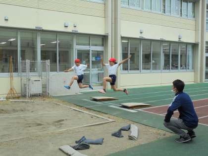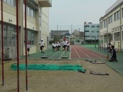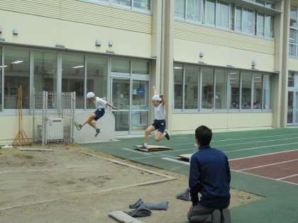 24日(火)の4時間目、4年1組は体育の時間でした。中校庭で「走り幅跳び」を行いました。今回は、踏み切るときにロイター板を使いました。少しでも遠くへ飛ぼうと強く踏み切っていました。