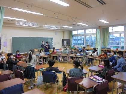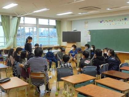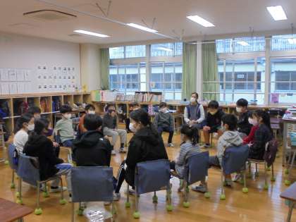 25日(水)の朝、たてわり班ごとに集まり、車座になって「サークル対話」を行いました。今回のテーマは、前回のたてわり班遊びの振り返りと次回の遊びの計画です。振り返りは、反省点ばかりではなく、よかったところも出し合いました。学年関係なく、自分の考えを相手に伝えることを大切にする取組です。