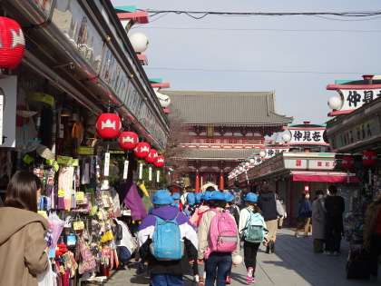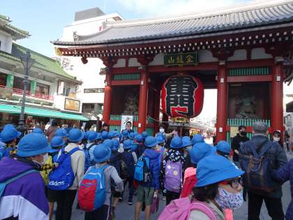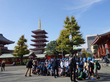 浅草もいつもより空いています。気温が高くなってきました。いよいよ仲見世で買い物をします。浅草寺さんは、東京で一番古いお寺です。五重の塔も輝いていました。1,2組混合のグループで行動します。チームワークが良い班ばかりでした。