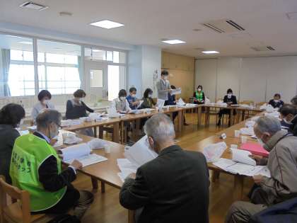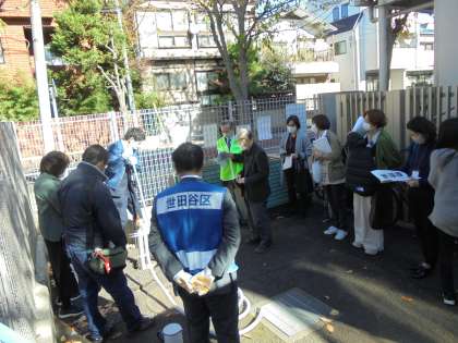 避難所運営委員会の前半は、太子堂まちづくりセンターの防災担当の方から、「中里小学校避難所運営マニュアルダイジェスト版」等の説明がありました。コロナ禍での避難所運営を考えなければいけないのが、昨年度との大きな違いです。後半は、校庭にある防災倉庫内を見学したり、西門近くで世田谷総合支所の方にスタンドパイプを組み立てていただいたりしました。